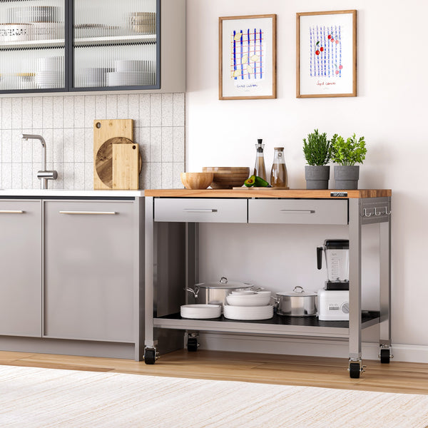 This kitchen cart is designed to offer both workspace and storage with its durable construction and convenient features. Ideal for use in kitchens, workshops, or even home garages, it combines a solid wood top with fingerprint-resistant stainless-steel elements and ample storage capacity.